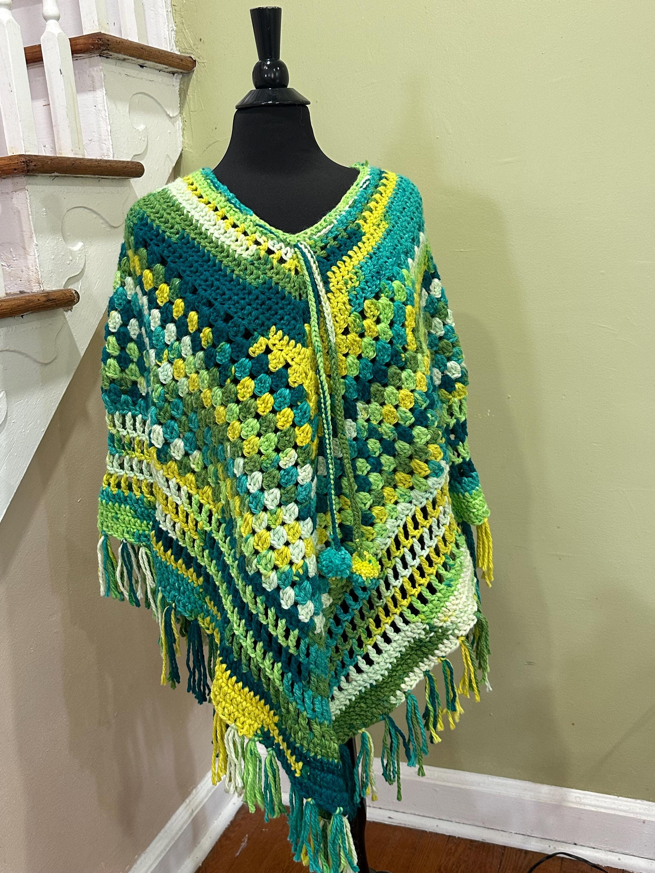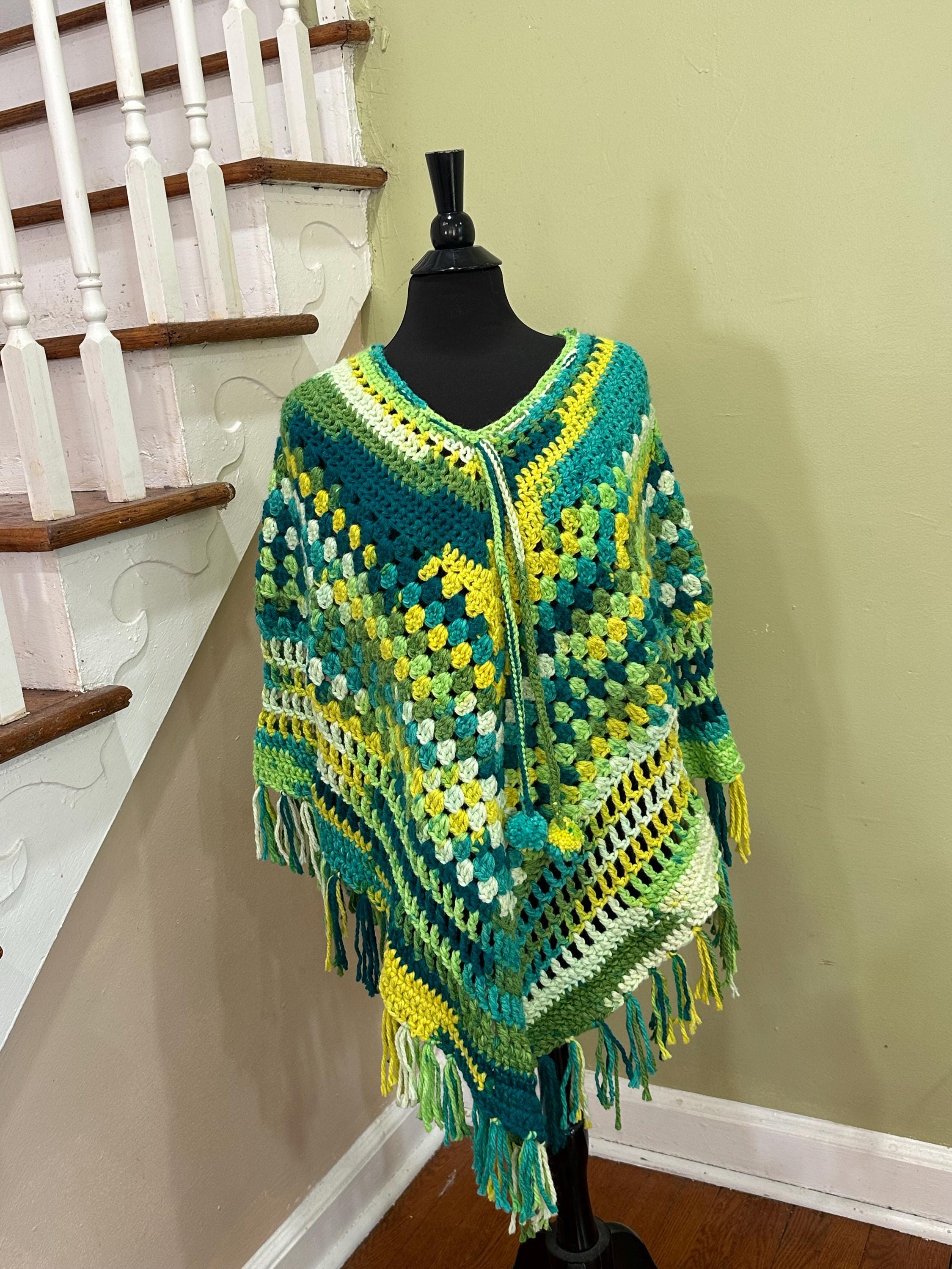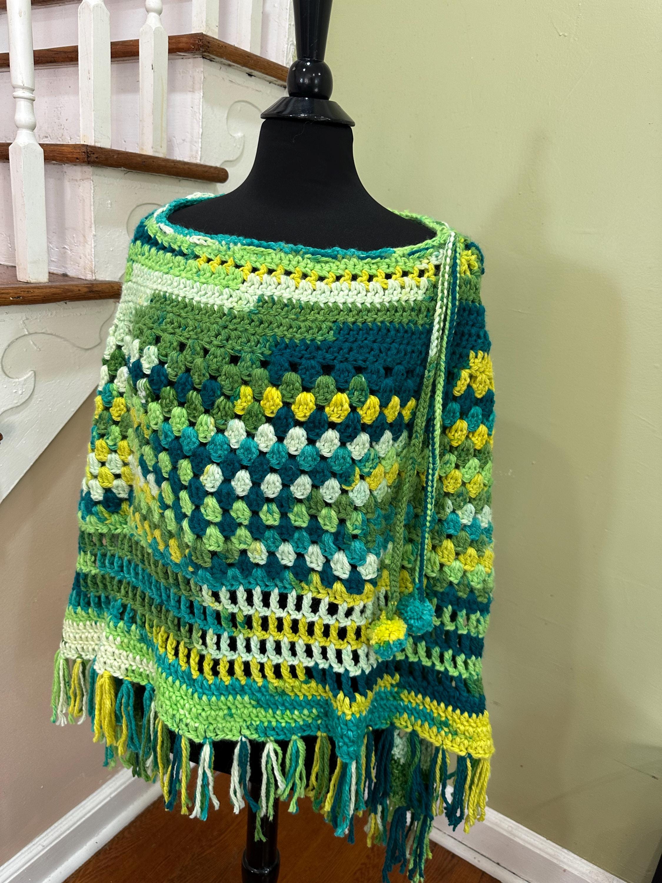 This beautiful multi-color crochet poncho is perfect for fall/springtime. It is made with 100% Acrylic yarn.