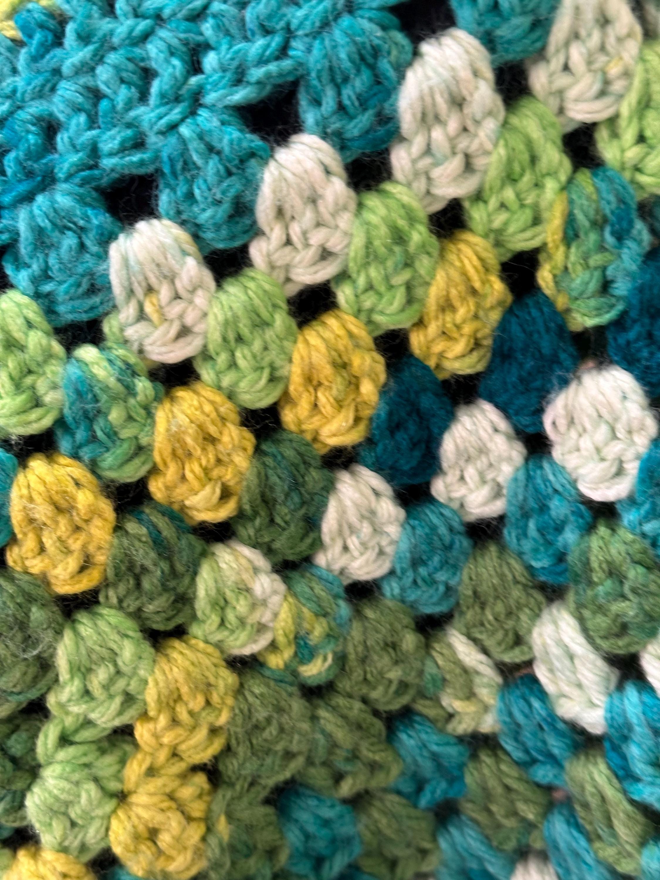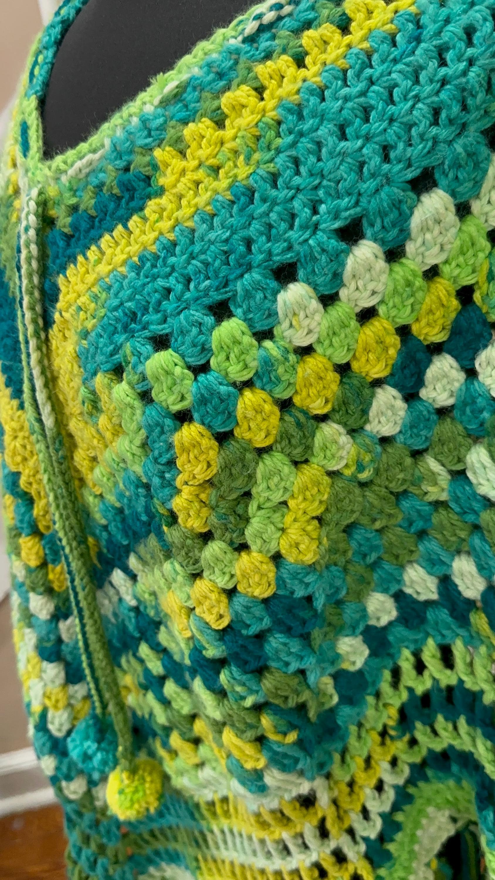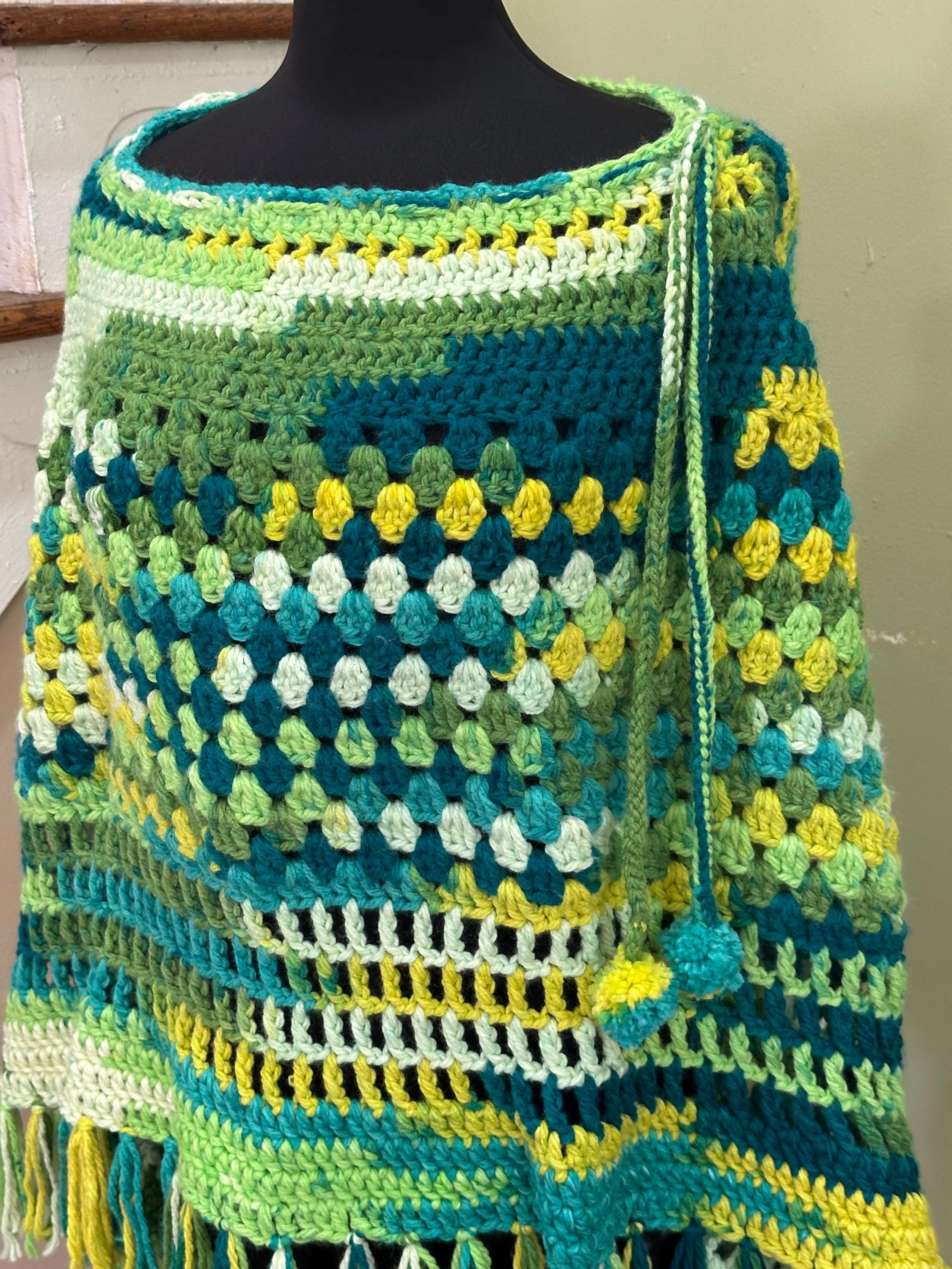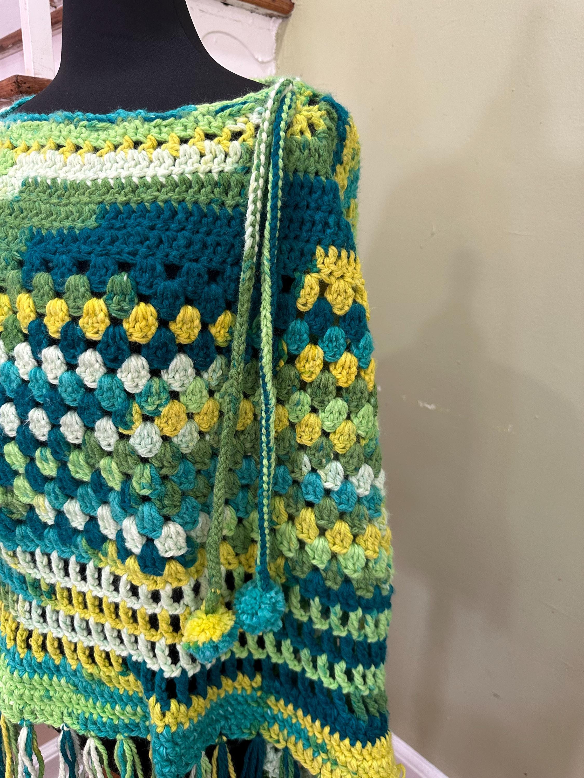 This beautiful multi-color crochet poncho is perfect for fall/springtime. It is made with 100% Acrylic yarn.